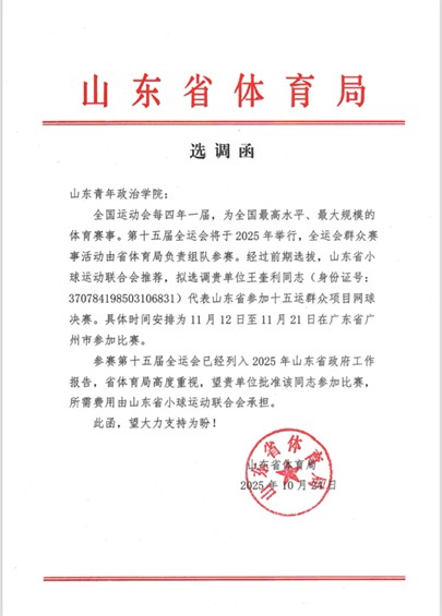 近日,第十五届全国运动会群众比赛网球项目决赛在广州南沙国际网球中心圆满落幕。我院教师王奎利作为山东省代表队的重要成员,历经层层选拔——先于省赛中勇夺桂冠,再通过全国预赛的激烈角逐,最终成功跻身全运会决赛舞台。在历时数月的比赛中,他发挥出色,与队友默契配合,助力山东代表队荣获混合团体赛全国第九名的优异成绩。